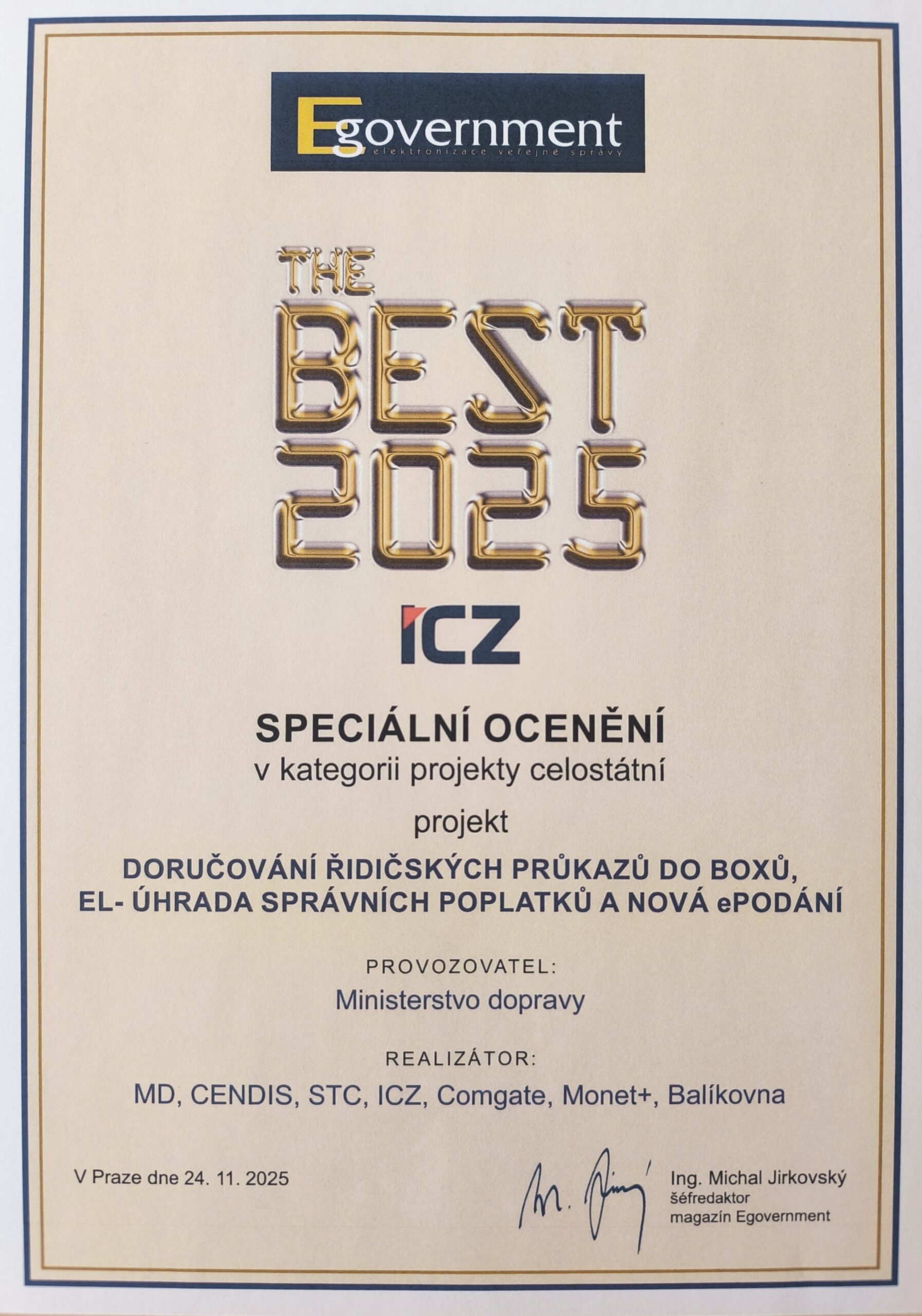 Uživatel 22025-12-02T16:09:05+01:00„Projekt doručování řidičských průkazů“, na kterém jsme se významně podíleli, obstál v opravdu silné konkurenci a získal mimořádná ocenění.